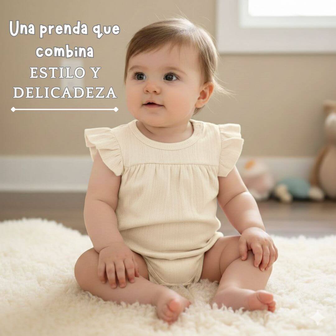 Body con voladitos confeccionado en algodón interlock desagujado 100% peinado, hipoalergénico y ultra suave al tacto. Ideal para pieles sensibles, garantiza confort y durabilidad — sin bolitas, sin deformarse y sin perder color después del lavado.