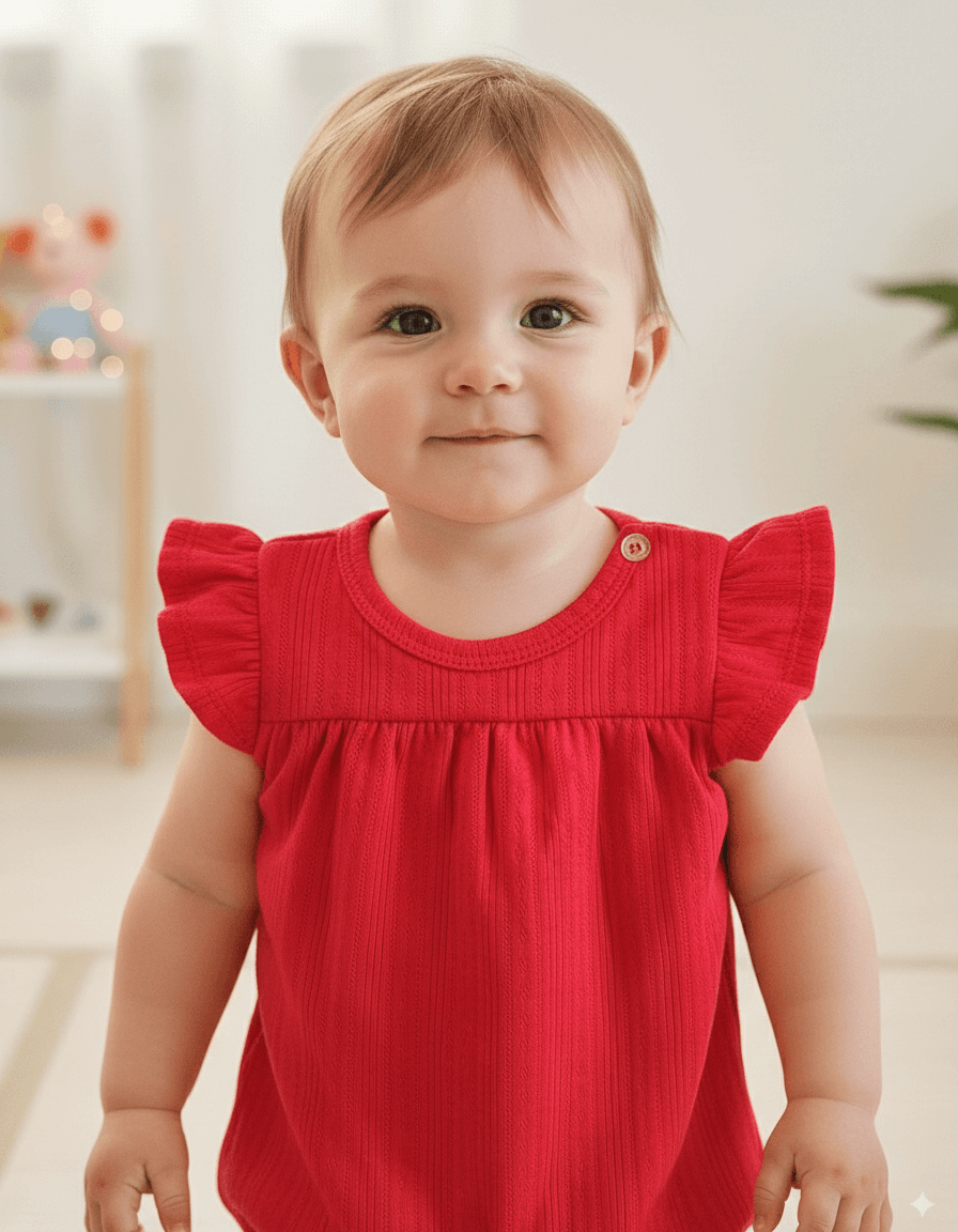 Body con voladitos confeccionado en algodón interlock desagujado 100% peinado, hipoalergénico y ultra suave al tacto. Ideal para pieles sensibles, garantiza confort y durabilidad — sin bolitas, sin deformarse y sin perder color después del lavado.