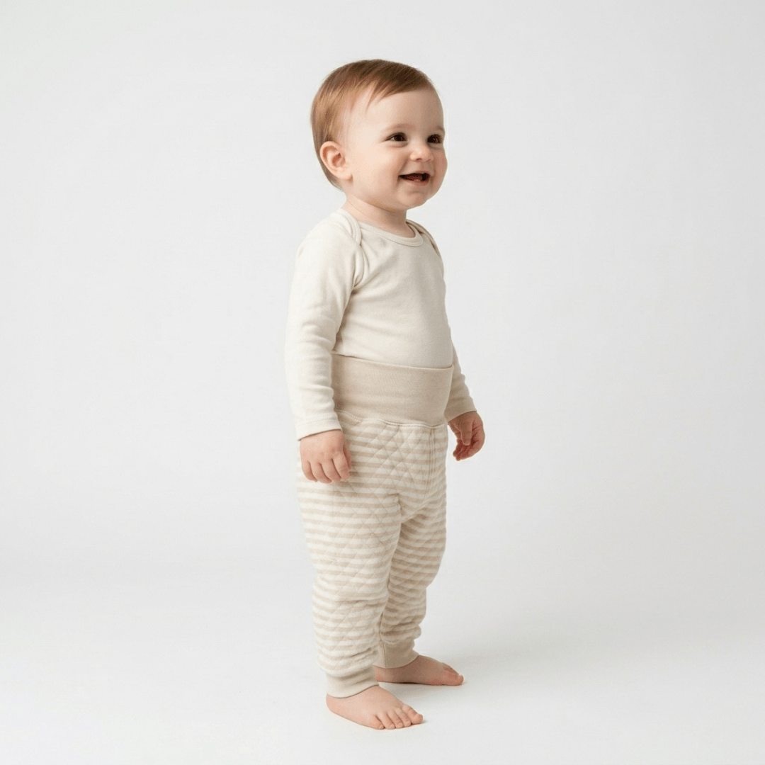 El diseño de cintura alta y ancha en rib de algodón ayuda a abrigar y proteger la zona de la panza y la espalda, evitando que el frío entre y que la prenda se enrolle. Una solución ideal para mantener al bebé calentito, incluso cuando se mueve o lo alzamos.