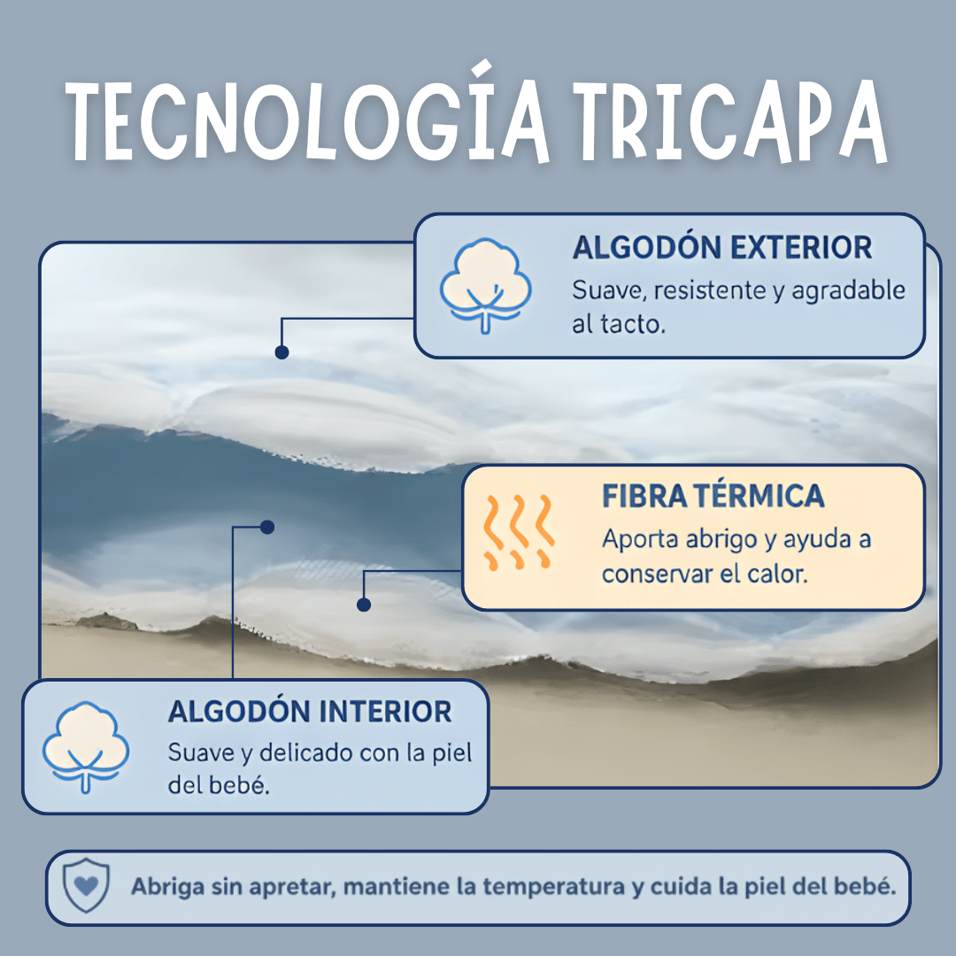 Confeccionados con dos capas de algodón 100% y una capa intermedia aislante que mantiene el calor corporal del bebé, sin abultar ni irritar la piel. Perfectos para usar tanto en interiores como para salir.